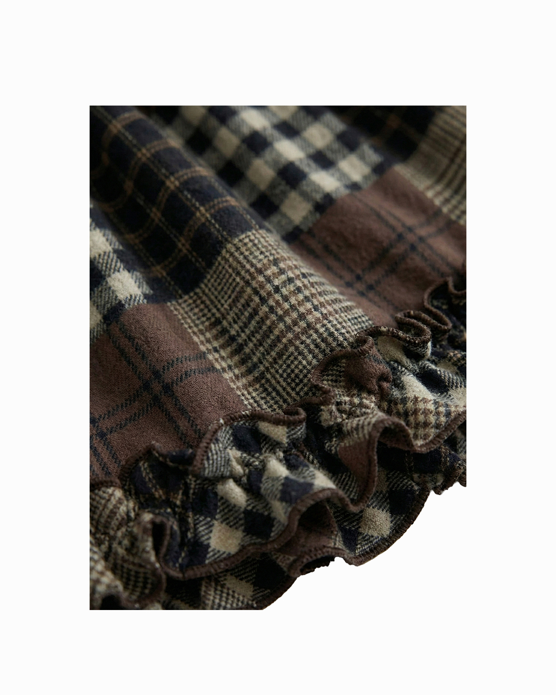 · Patchwork plaid panels throughout